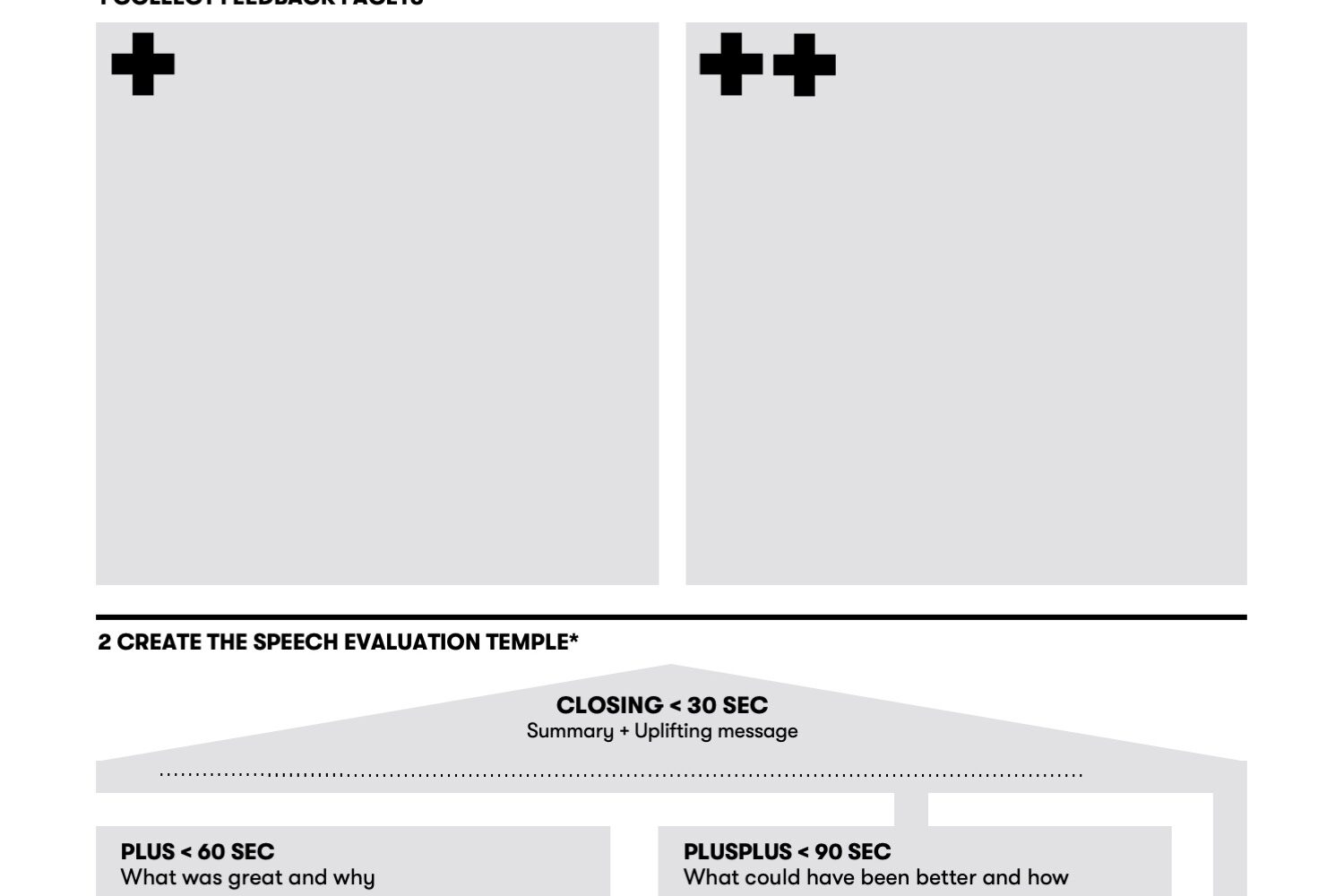While a speaker gives a speech use the left side of the speech evaluation template to take notes. Write down everything you like about the speech in the left column “PLUS”. Write down everything the speaker could do even better from your point of view in the right column “PLUSPLUS”.